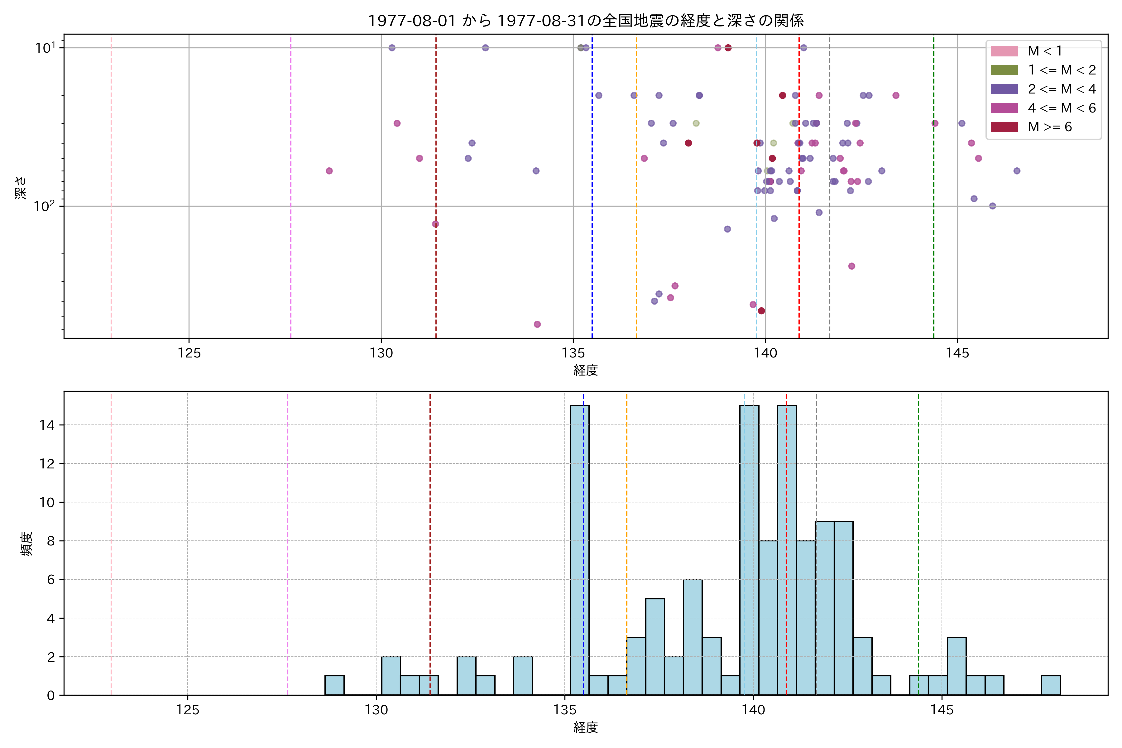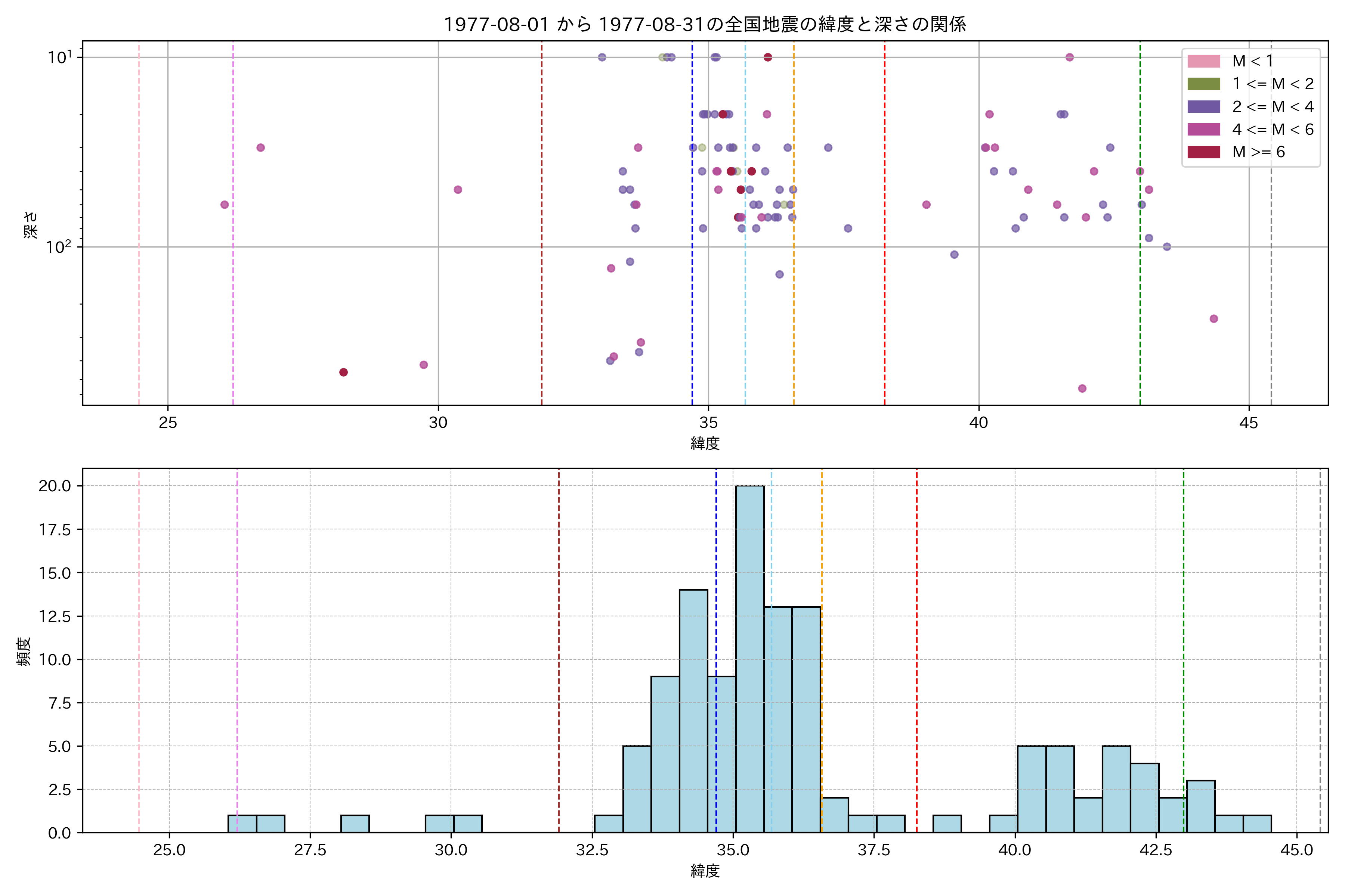 1977年8月 マグニチュード 0 以上震源マップ