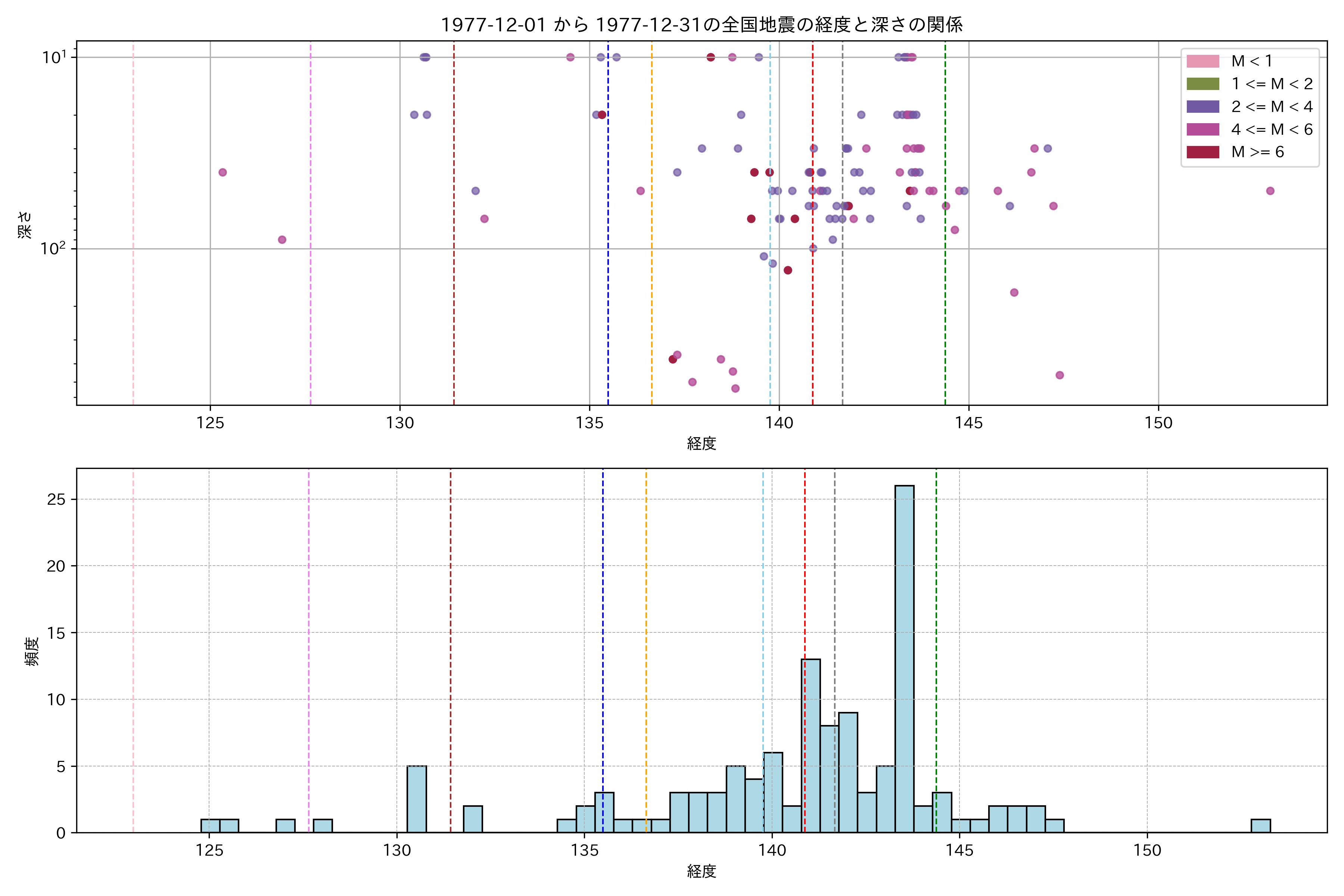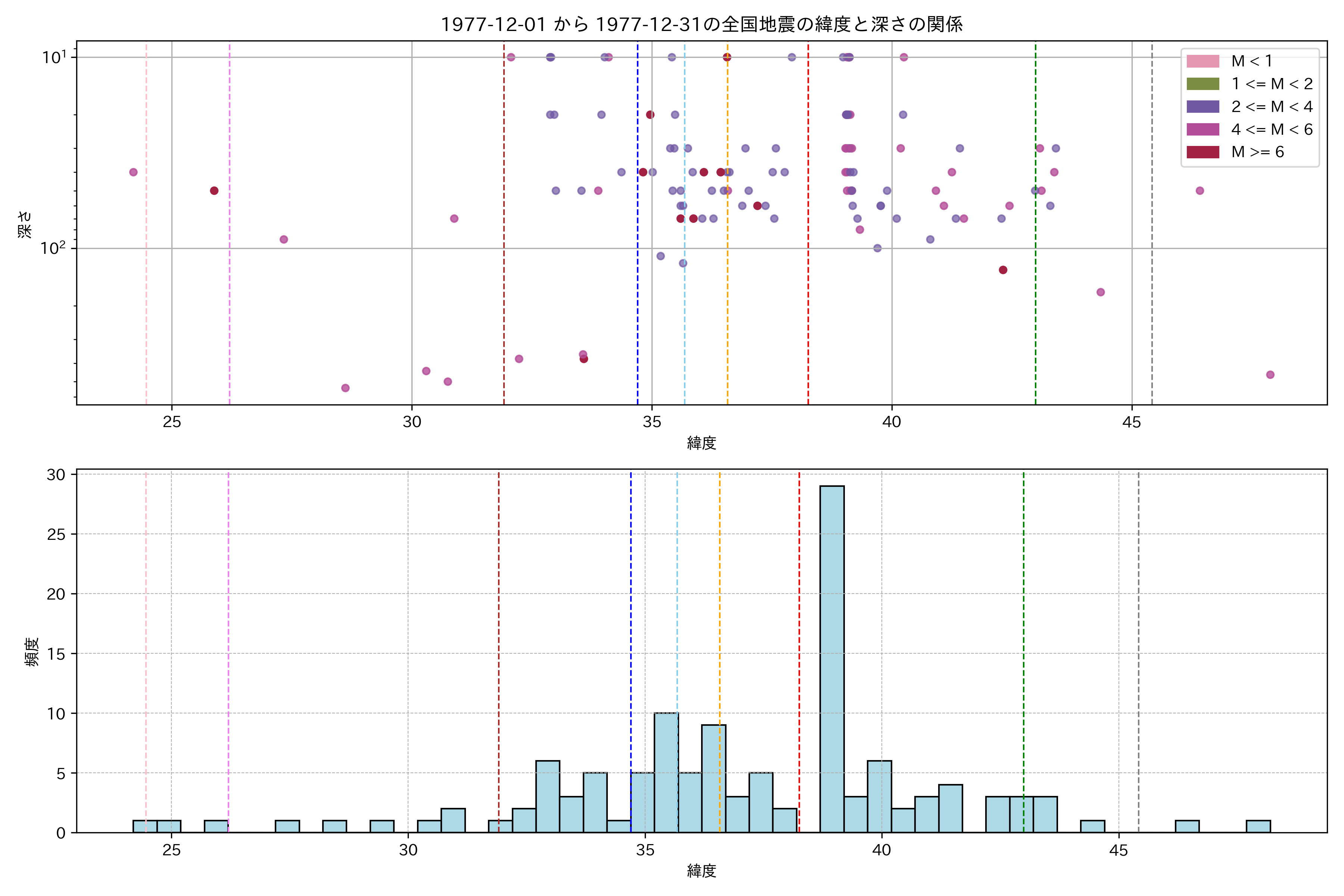 1977年12月 マグニチュード 0 以上震源マップ