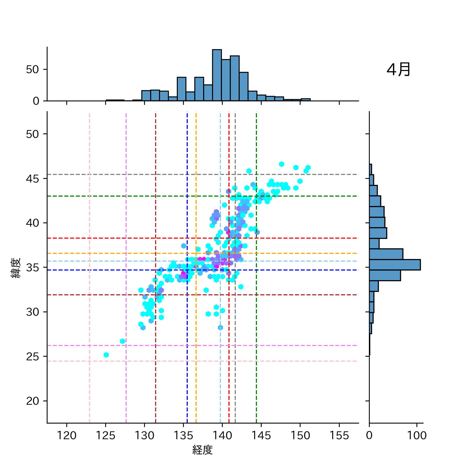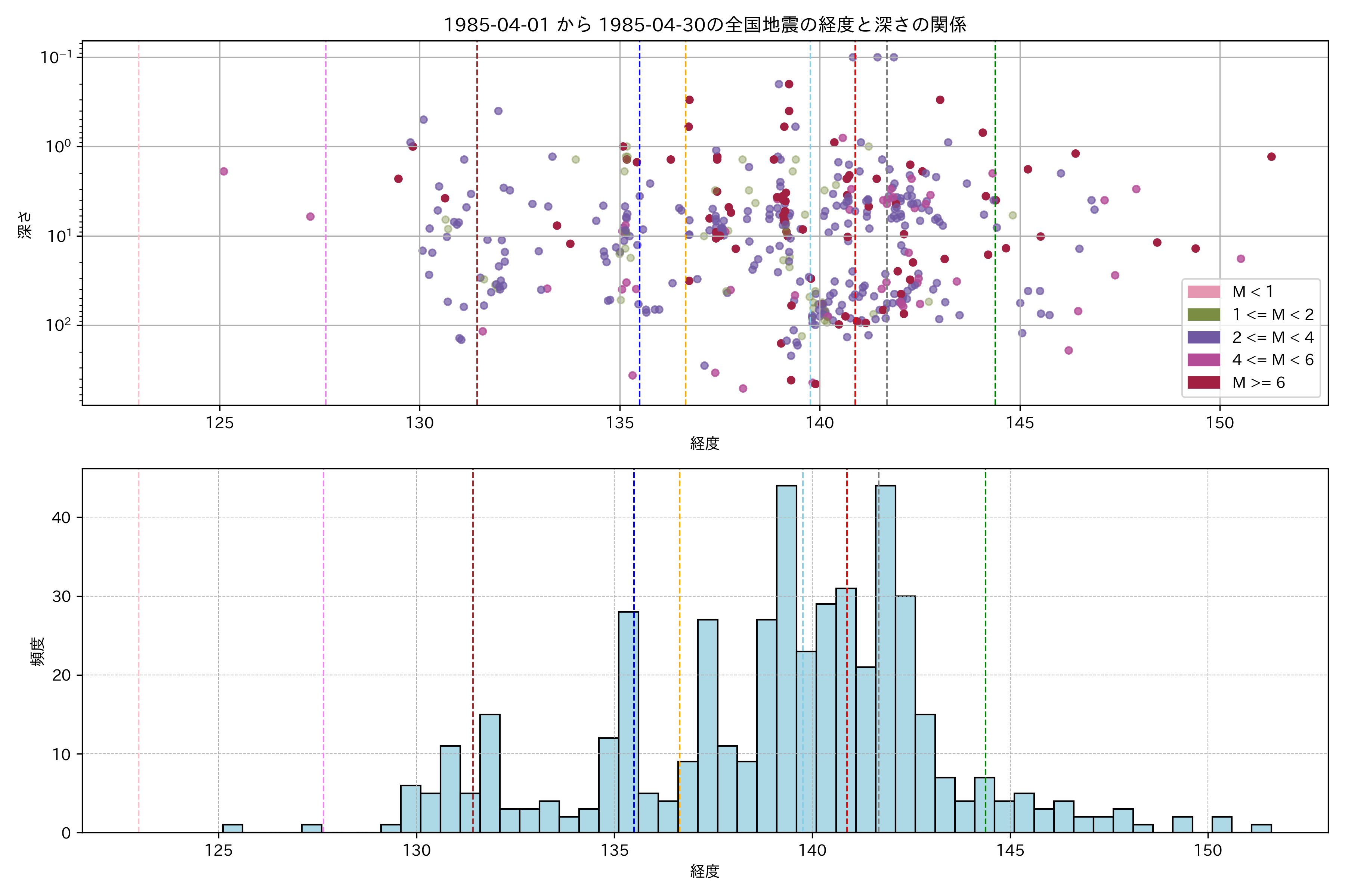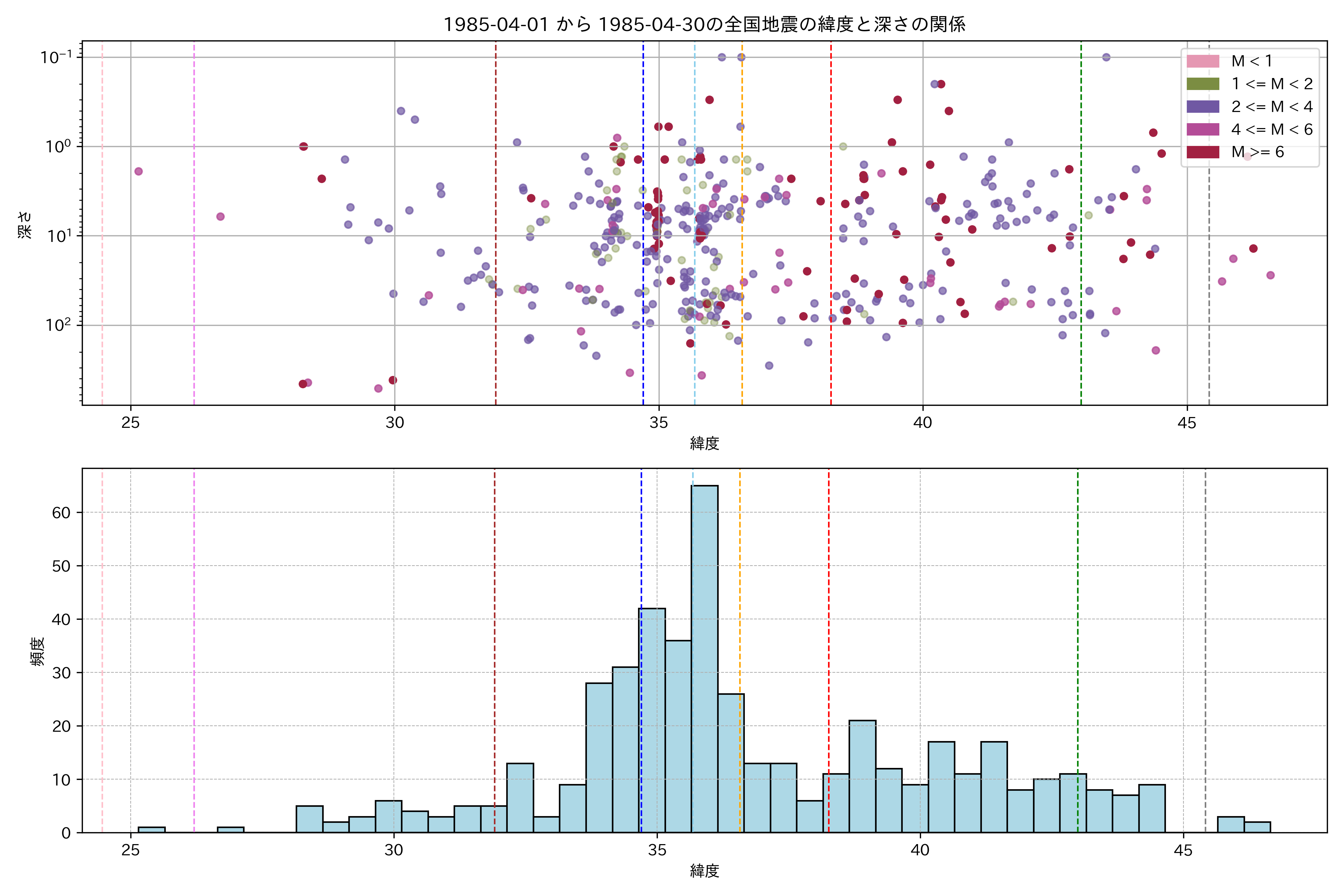 1985年4月 マグニチュード 0 以上震源マップ