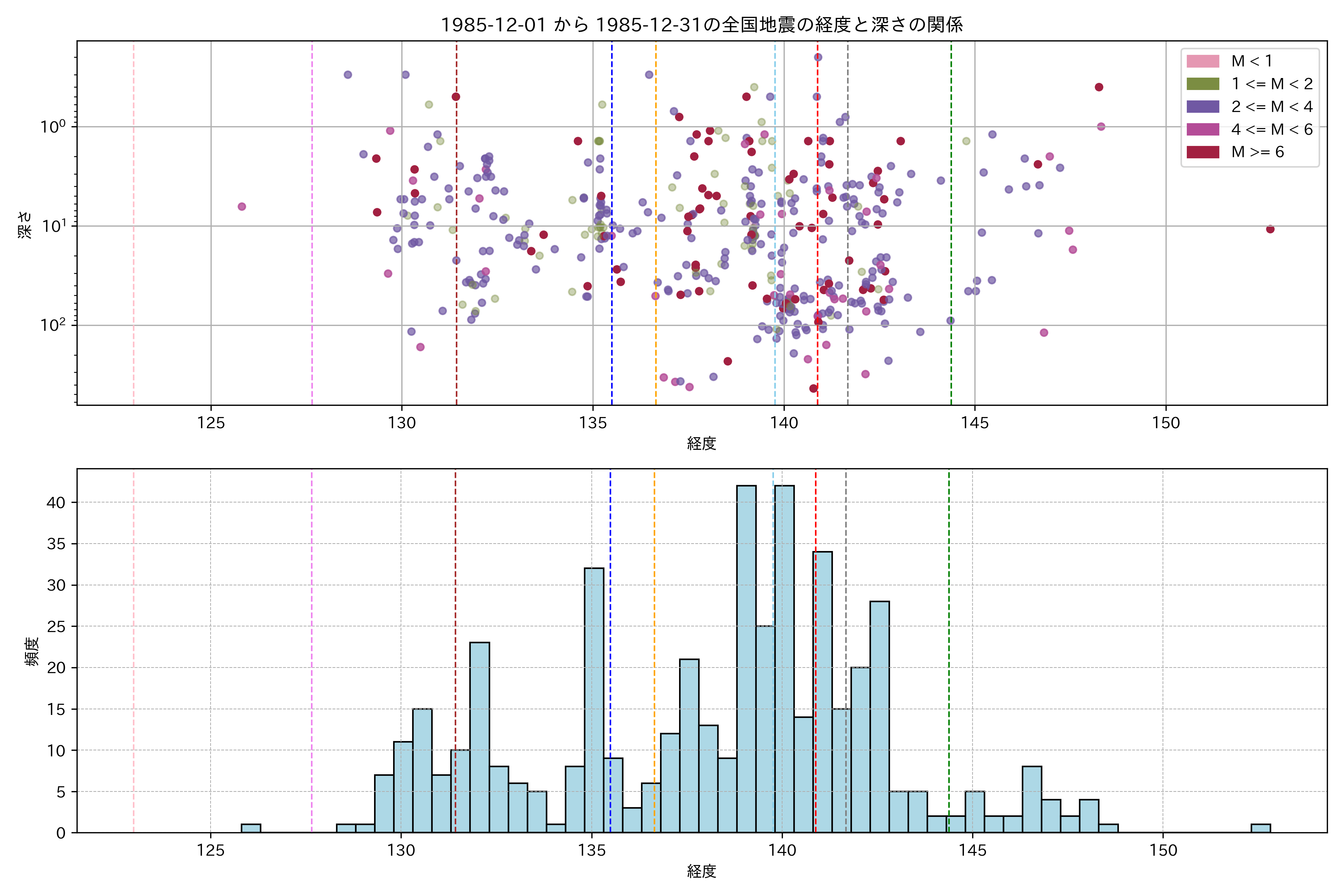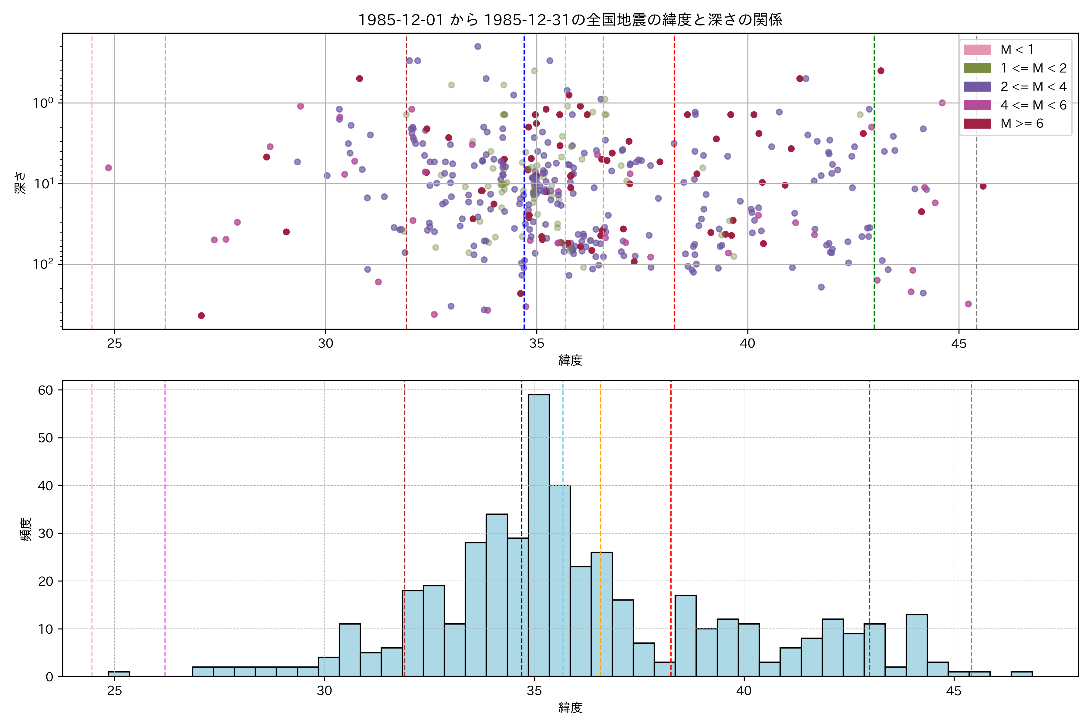 1985年12月 マグニチュード 0 以上震源マップ