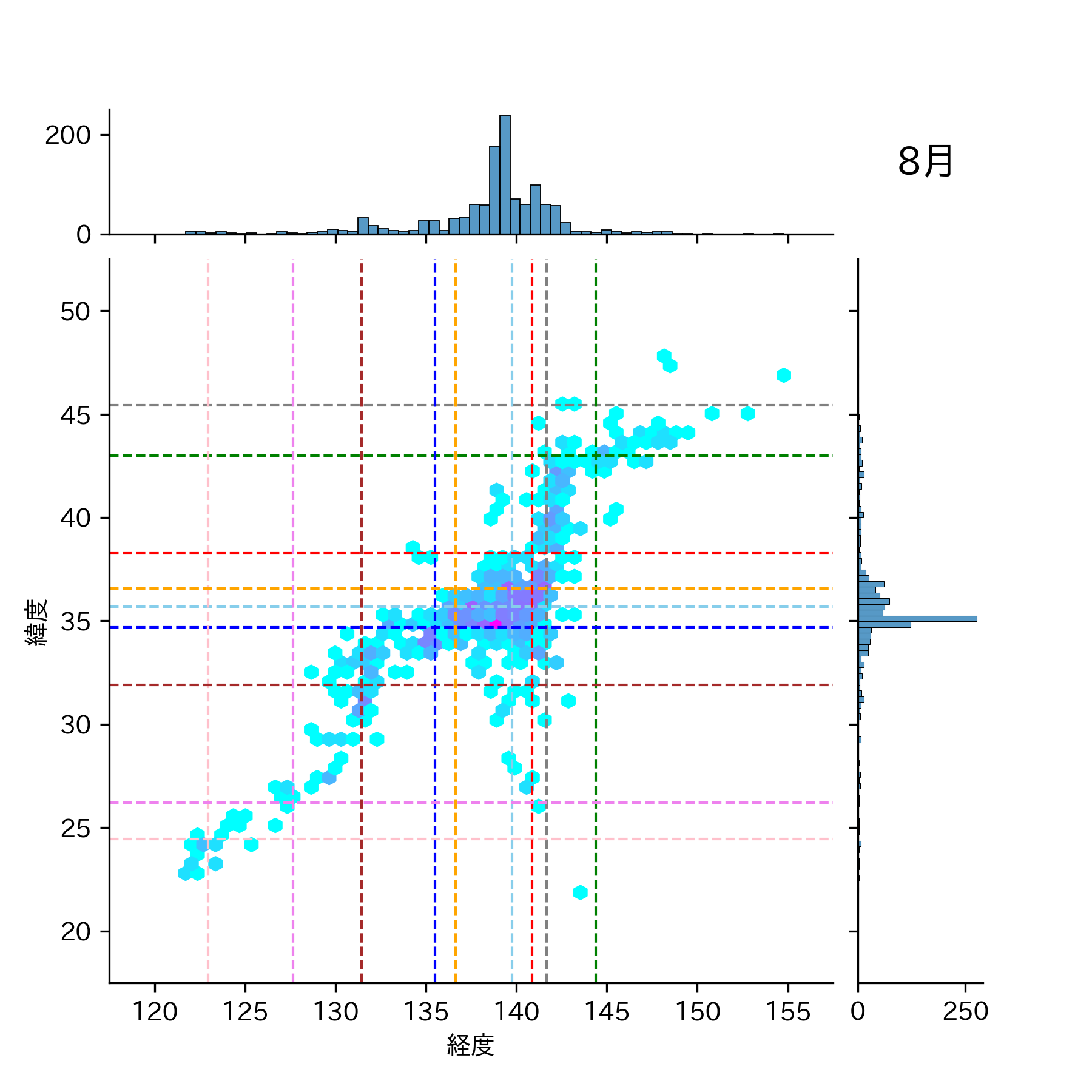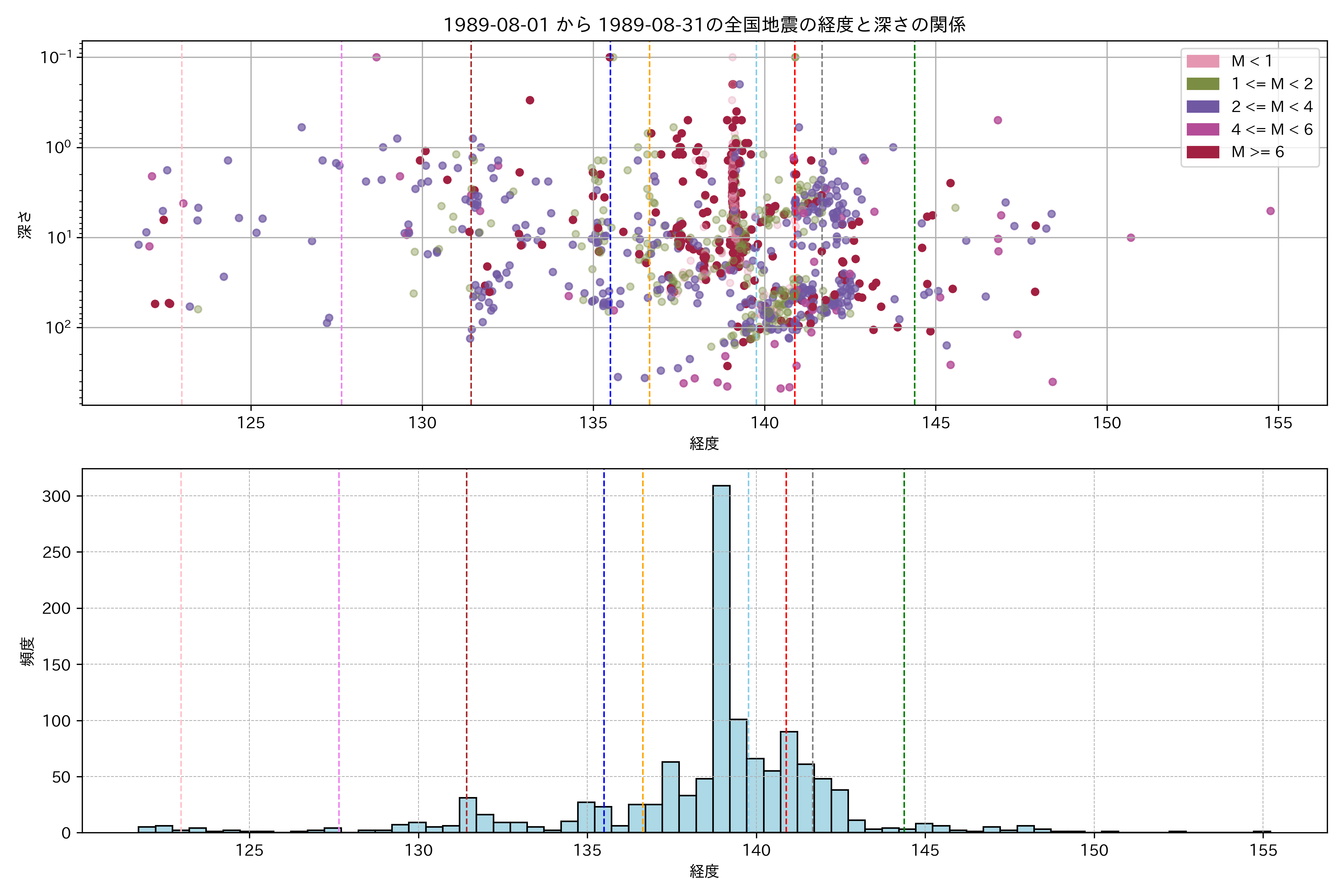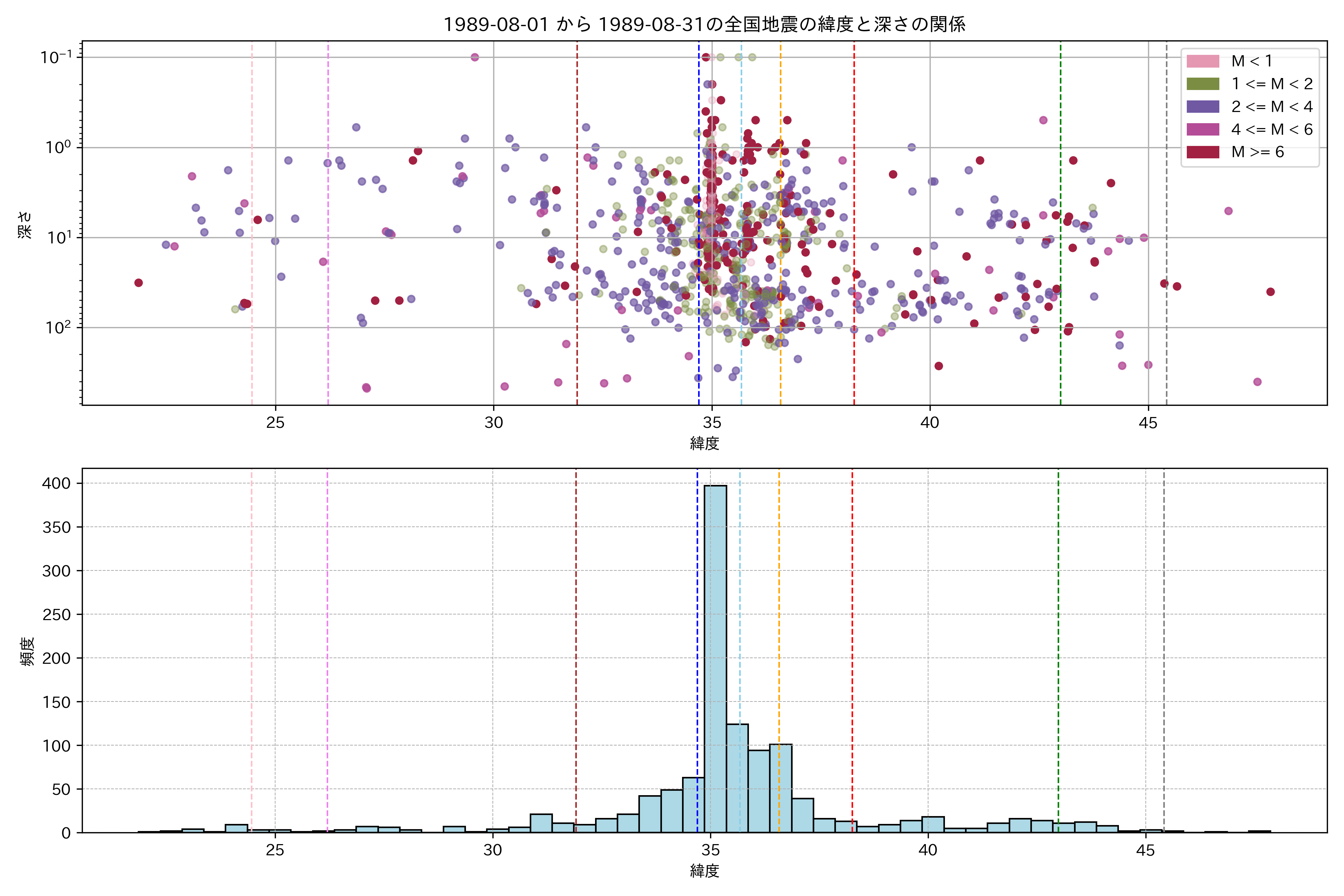 1989年8月 マグニチュード 0 以上震源マップ