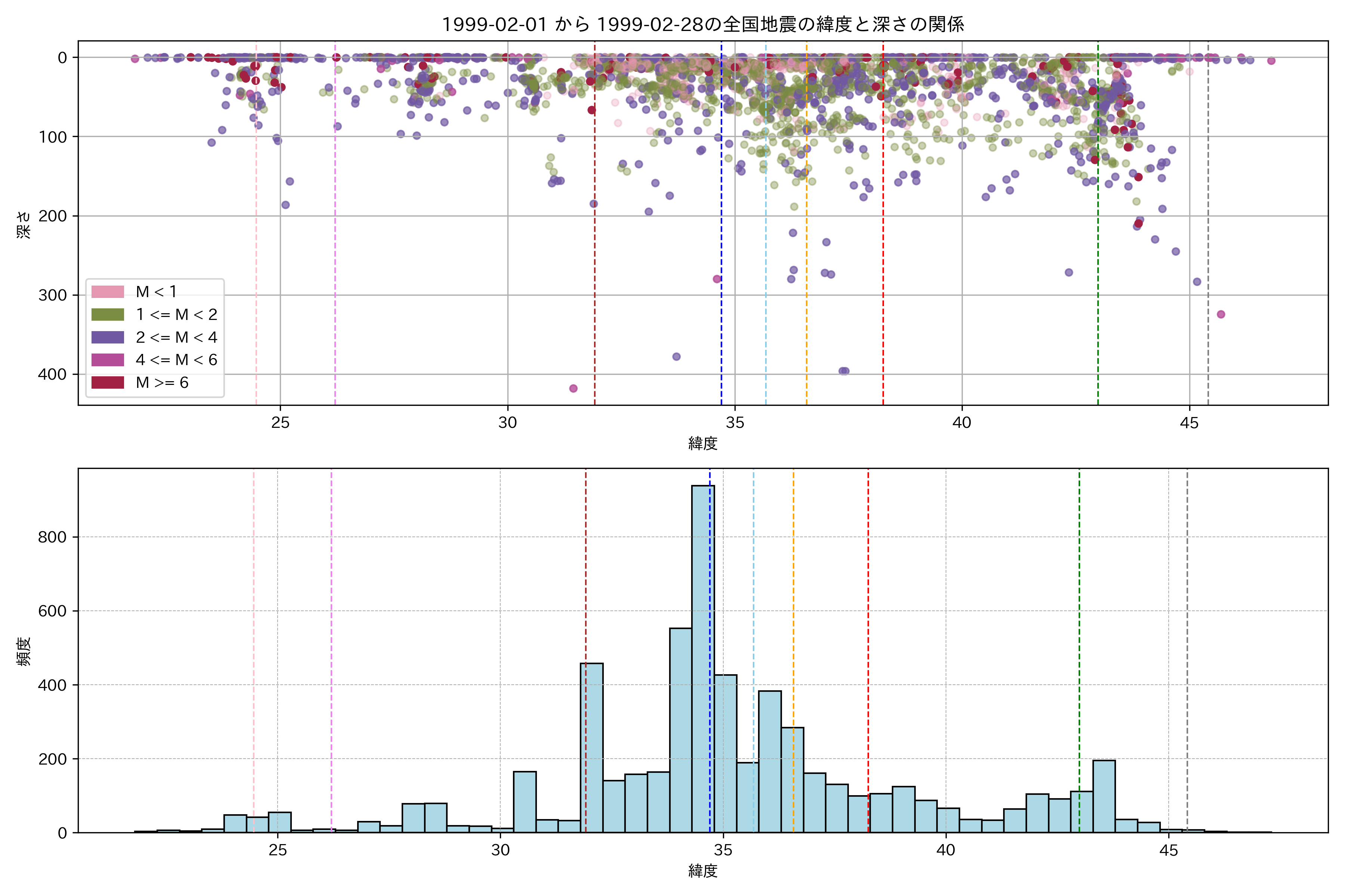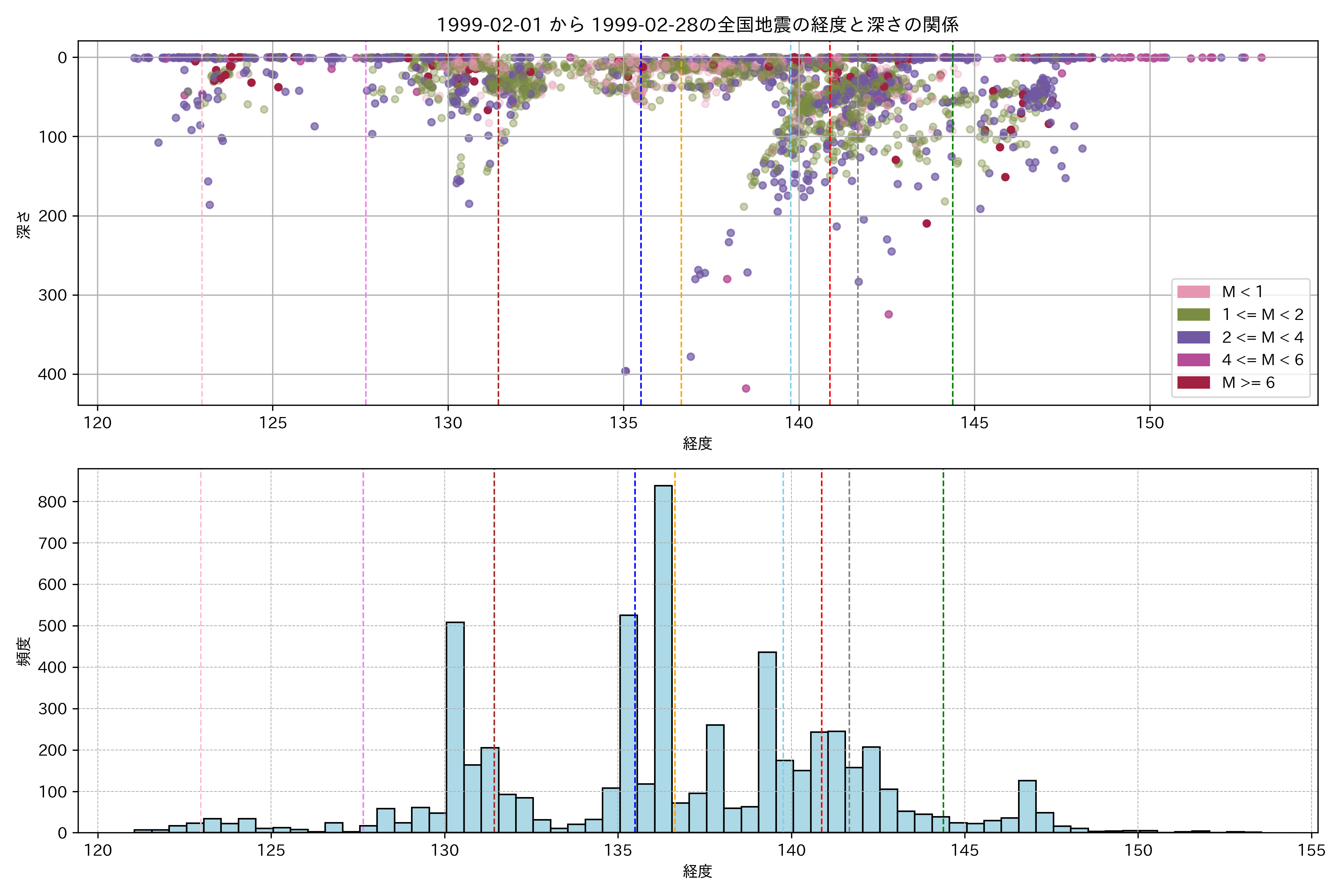 1999年2月 マグニチュード 0 以上震源マップ