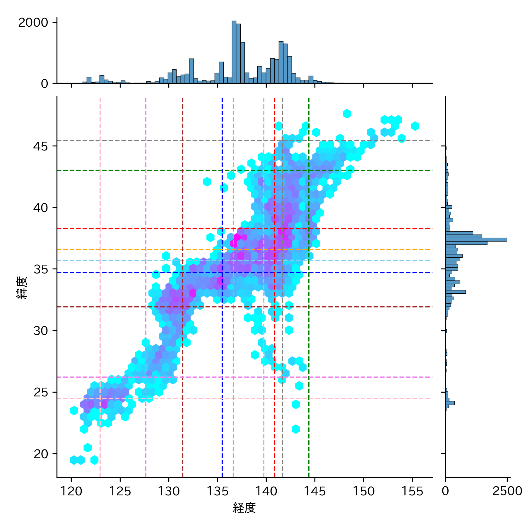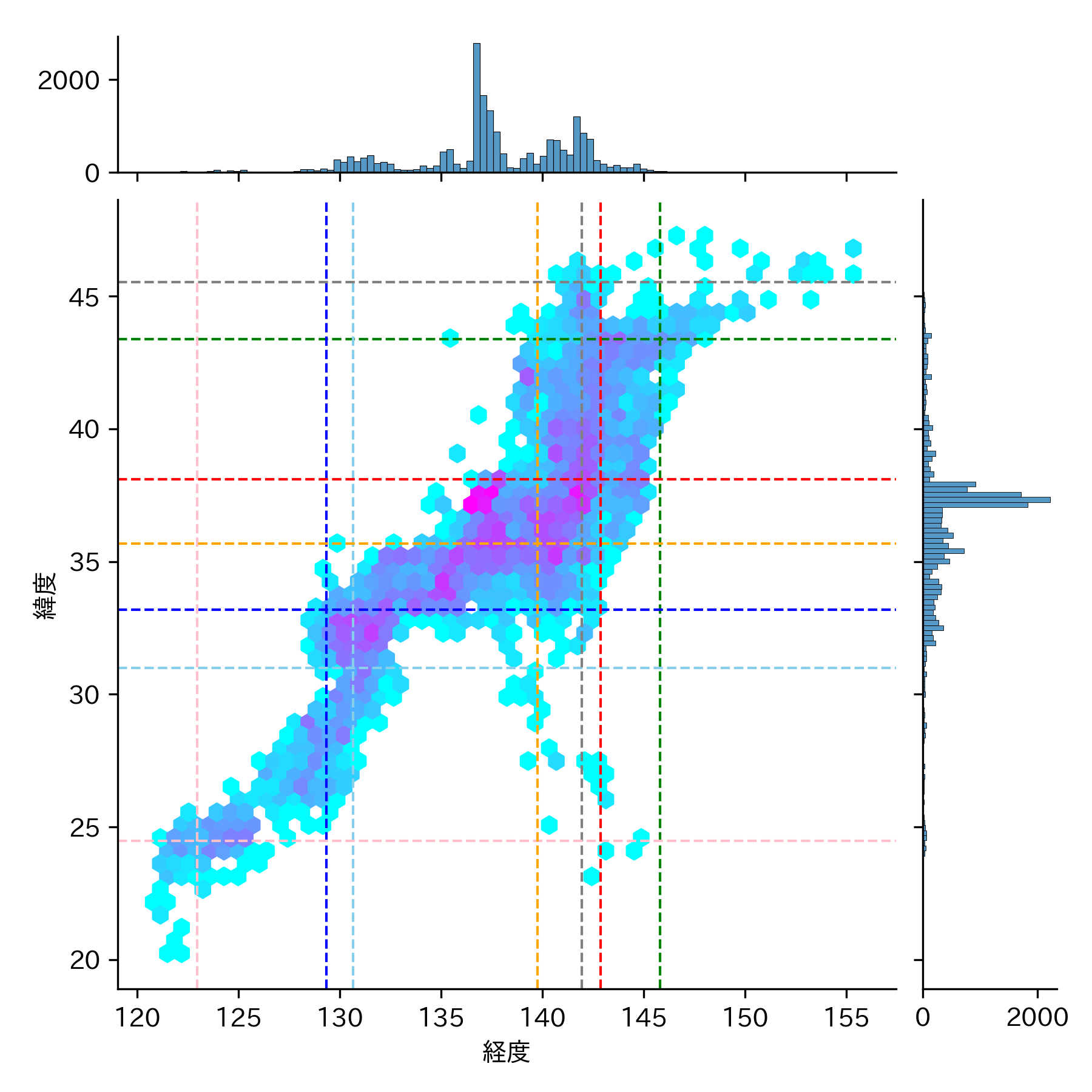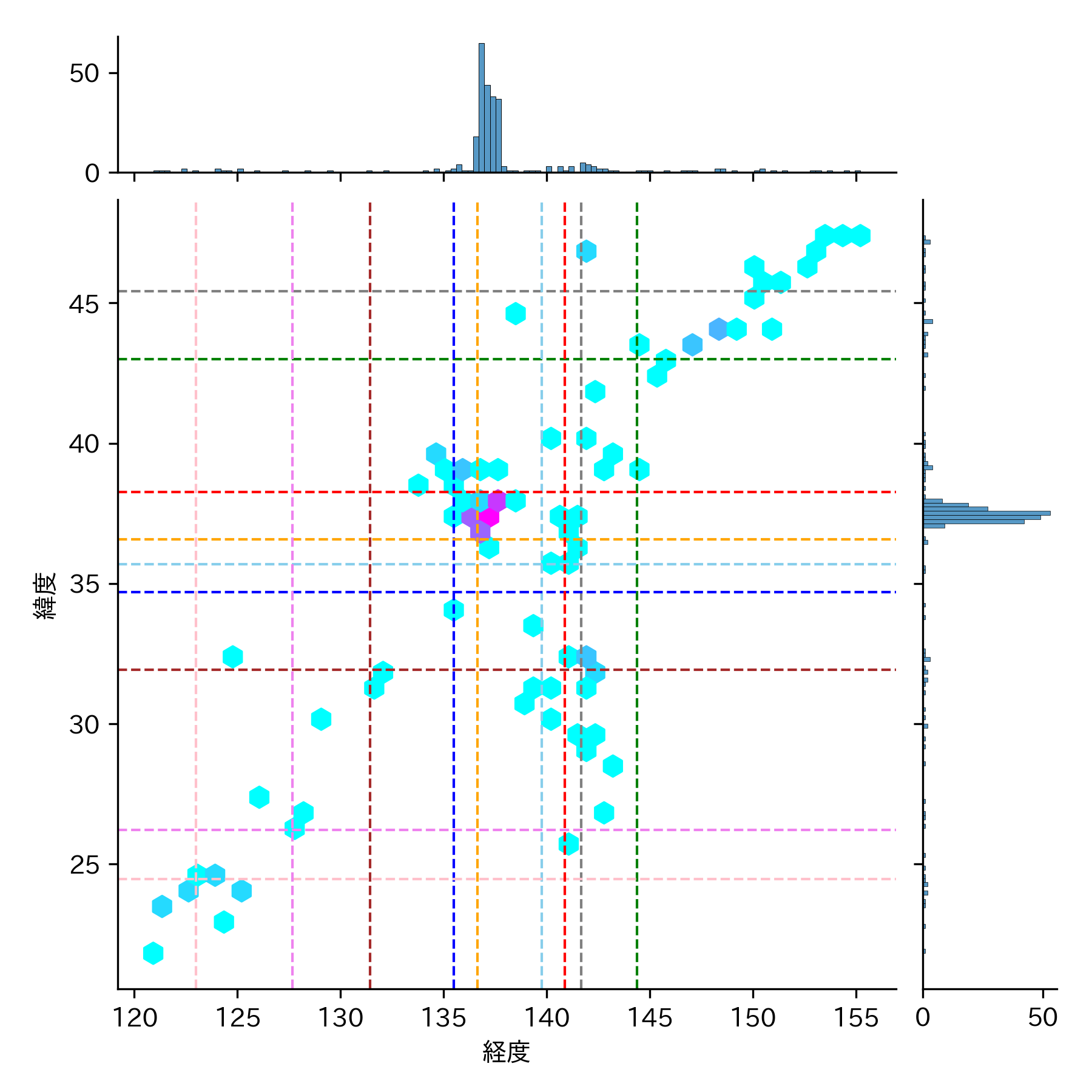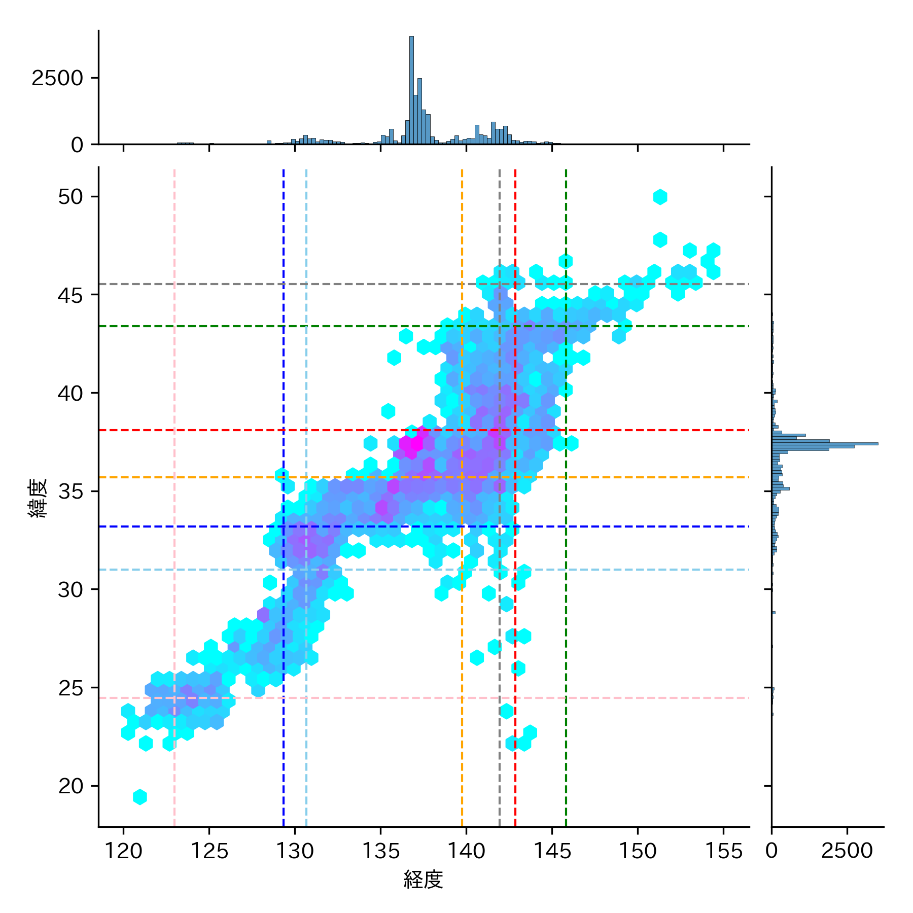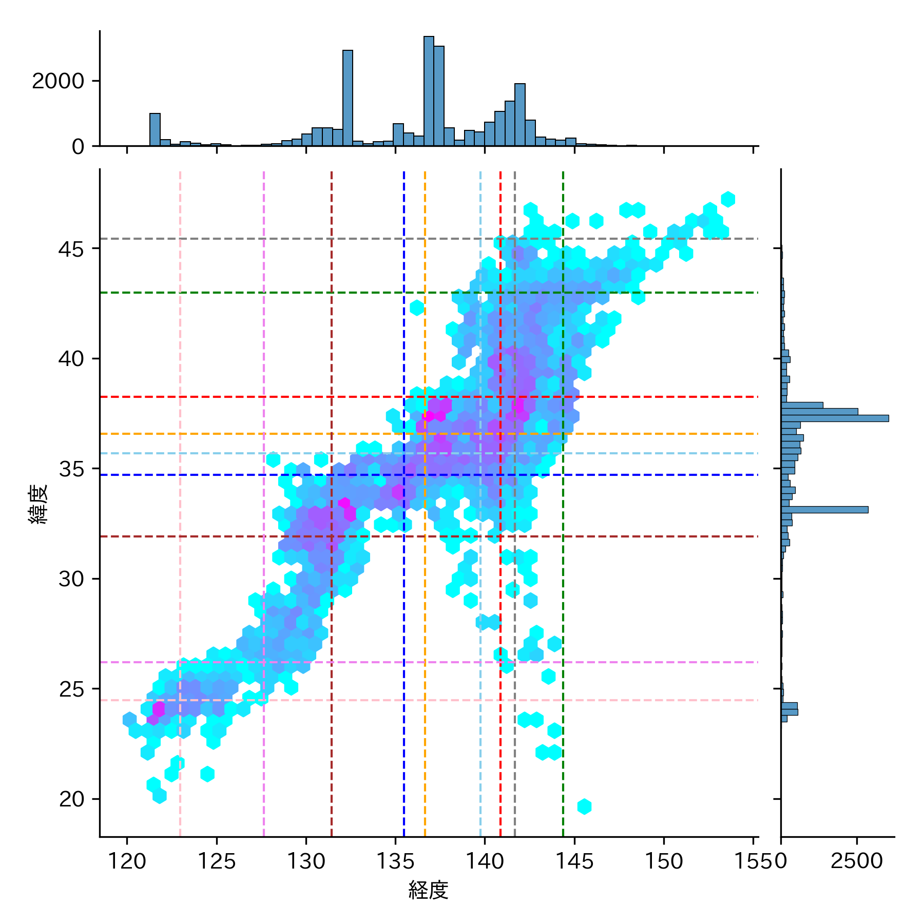 地震の頻度が低い(水色)▶ 高い(紅色)のグラデーションになっています。