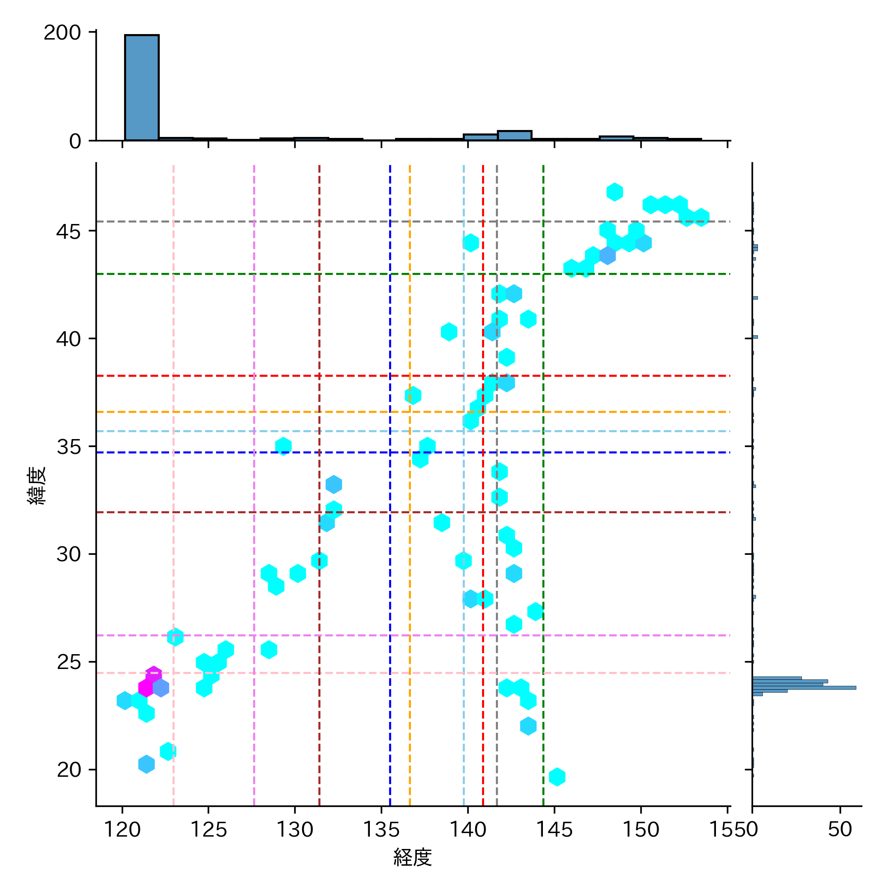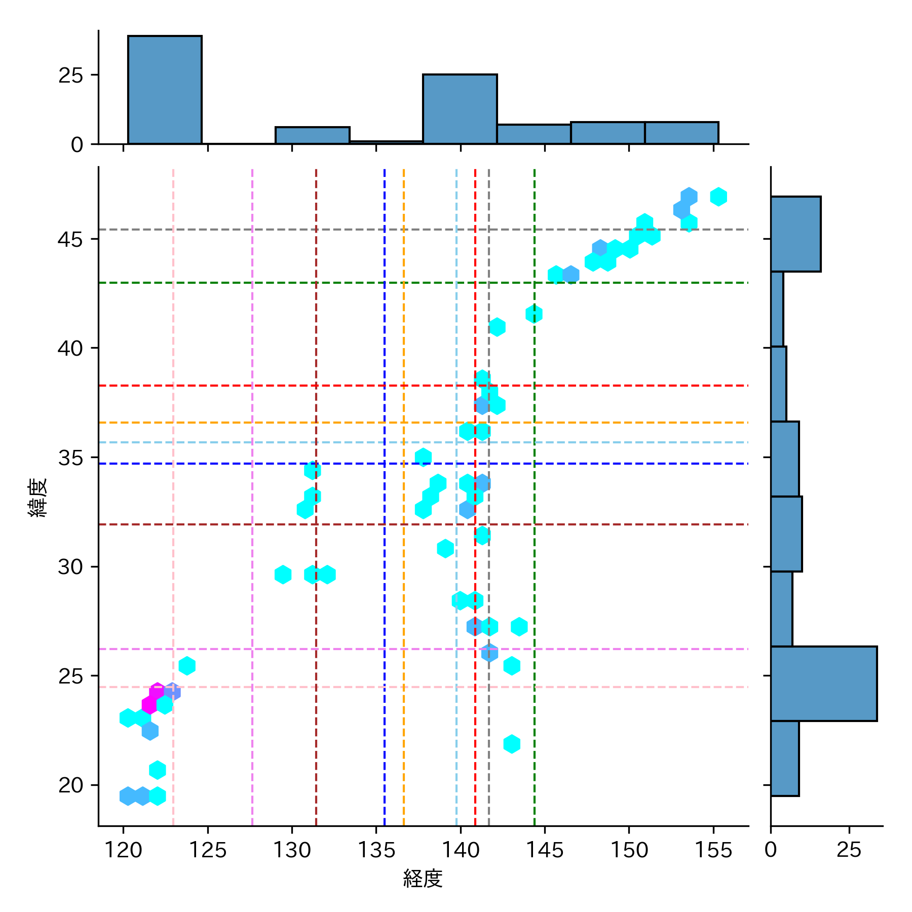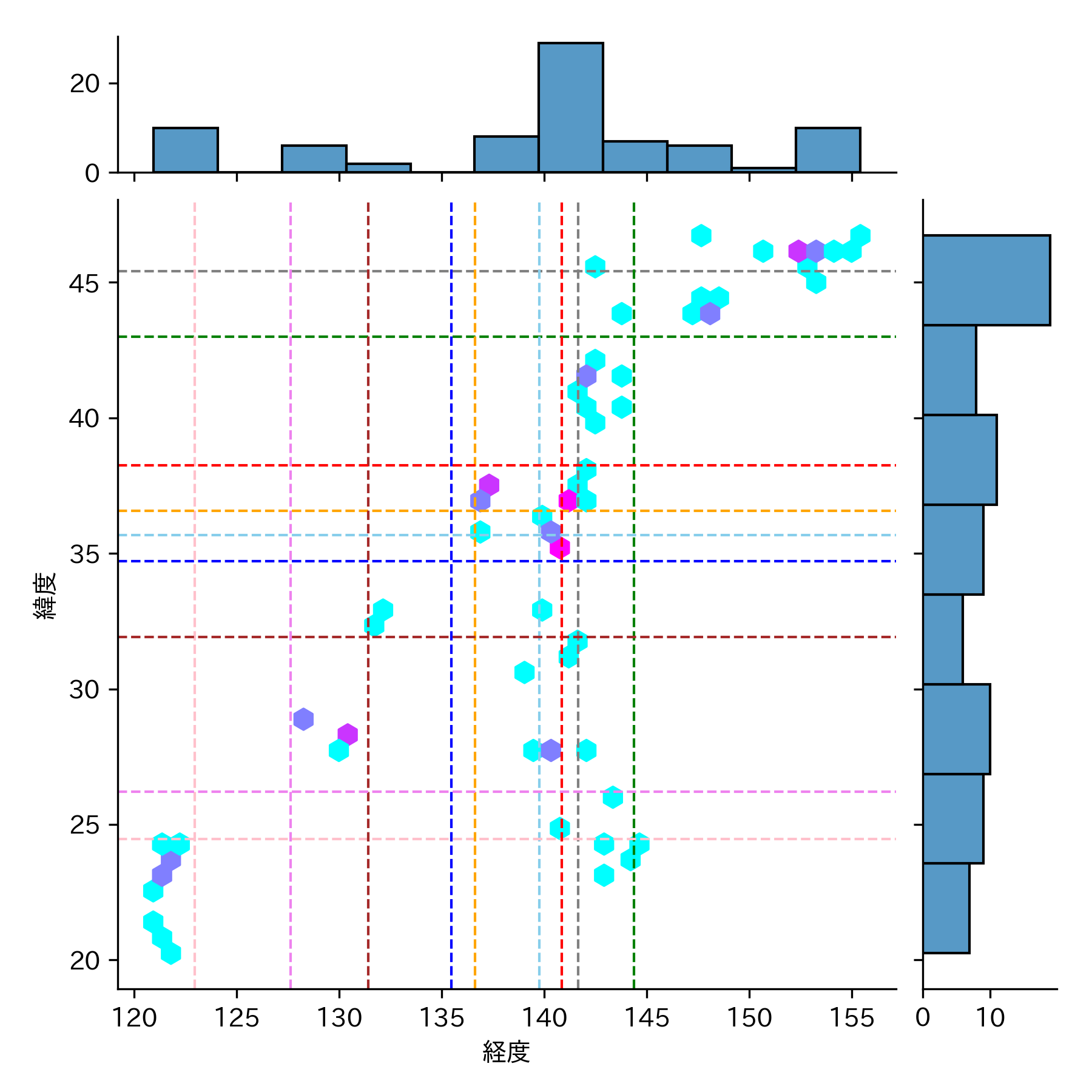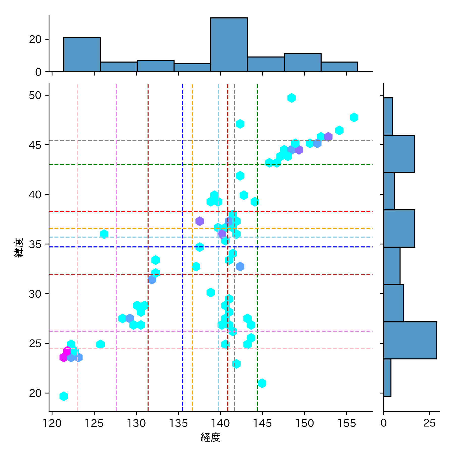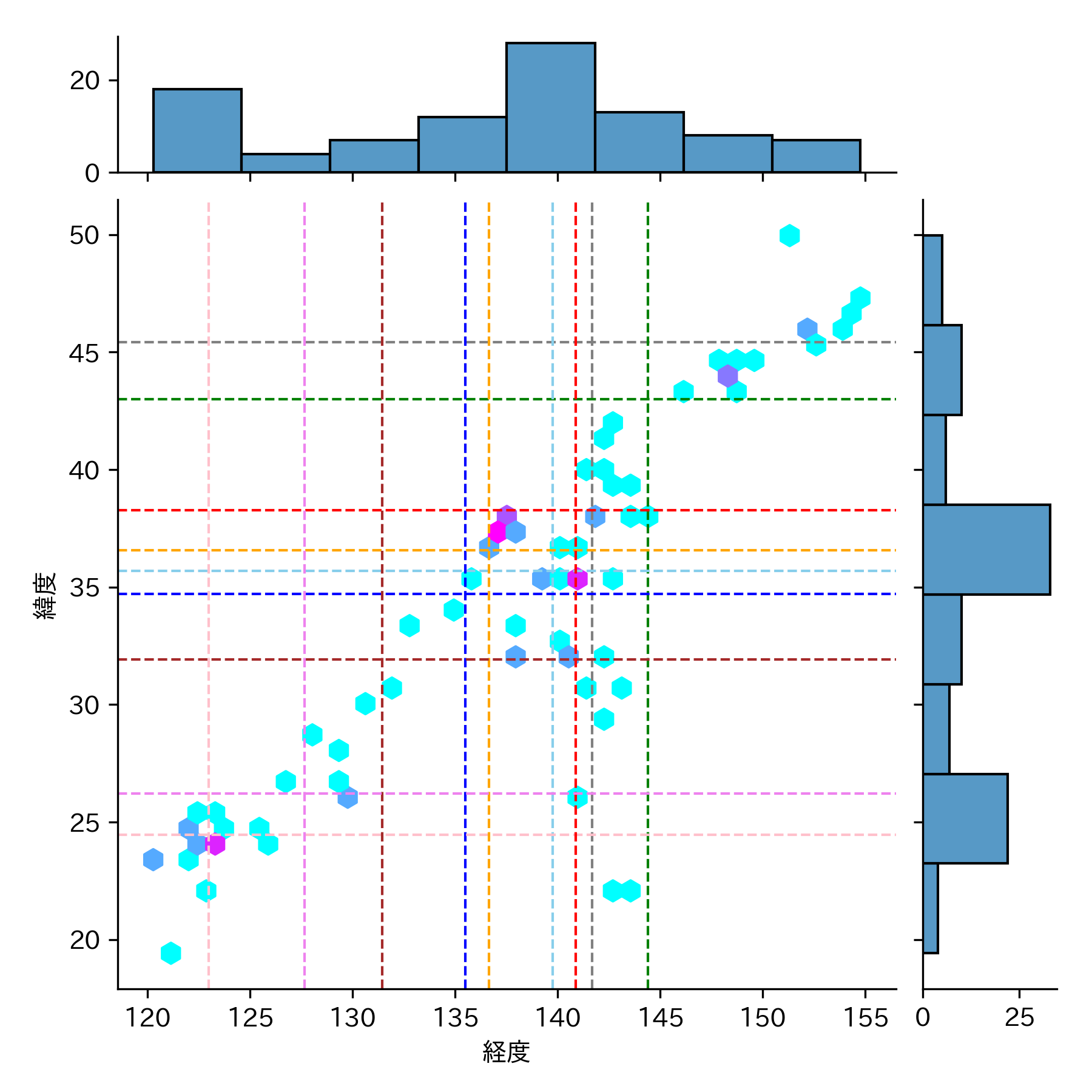地震の頻度が低い(水色)▶ 高い(紅色)のグラデーションになっています。